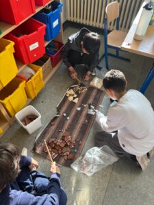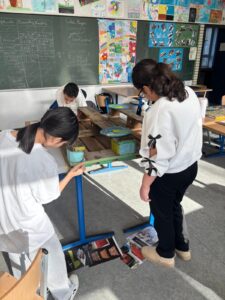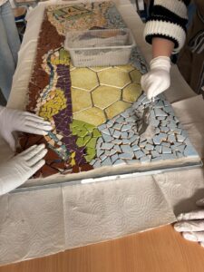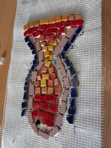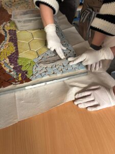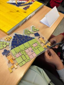 Dabei verwandelte sich der Klassenraum regelmäßig in ein Atelier: Ausgehend von eigenen Entwürfen entwickelten die Schülerinnen und Schüler verschiedene Motive zu unterschiedlichen Themen, etwa zur Unterwasserwelt. Diese wurden mit viel Geduld und Kreativität aus zerkleinerten, bunten Fliesen Stück für Stück zu individuellen Mosaiken zusammengesetzt.